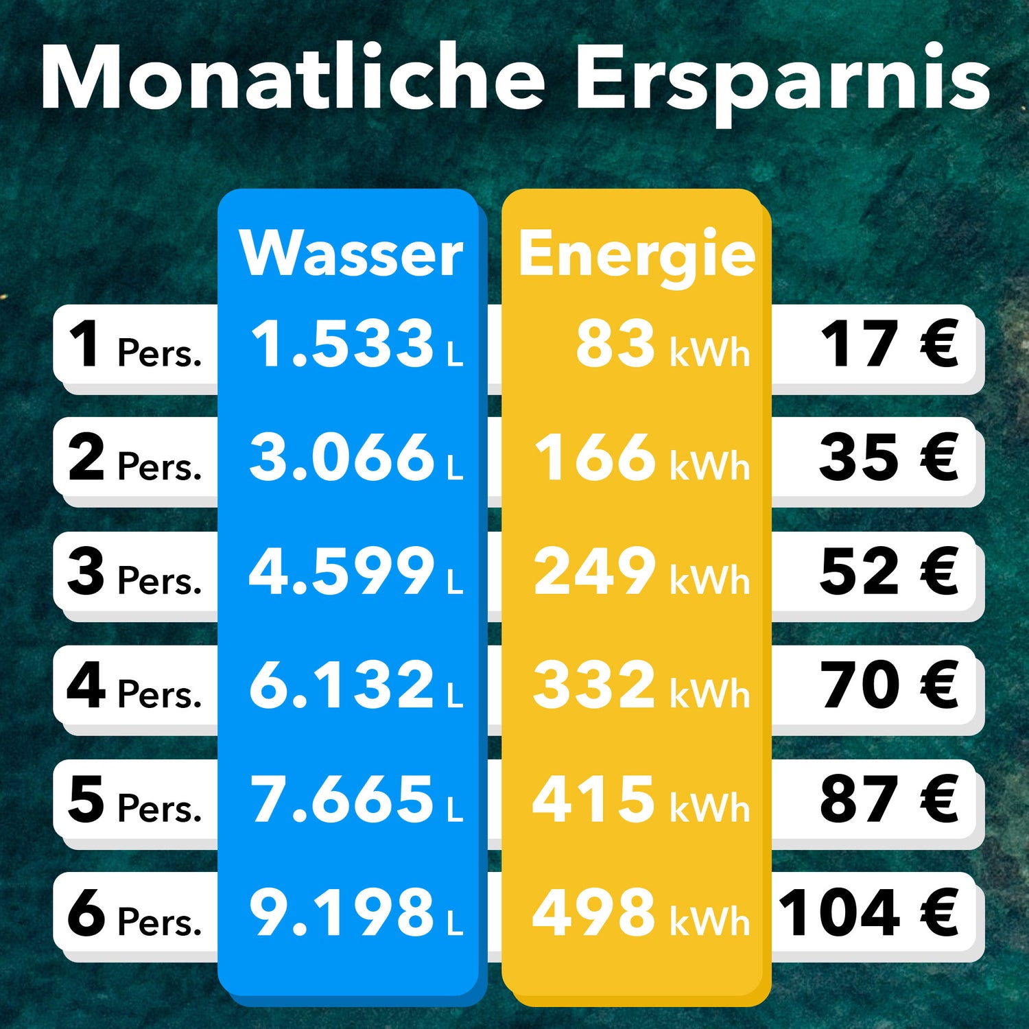 Wir gehen in unserer Schätzung davon aus, dass ein normaler 12L-Duschkopf ersetzt wird. Bei einer Duschdauer von 8 min. täglich pro Person und Wassererwärmung per Gas-Brennwertkessel.